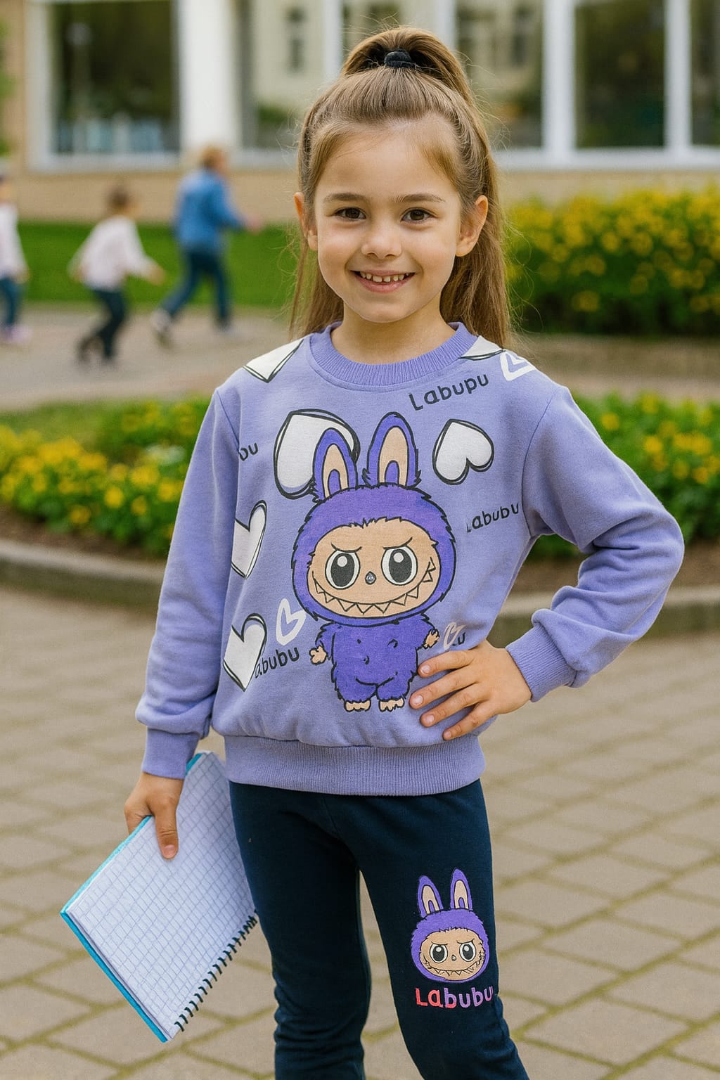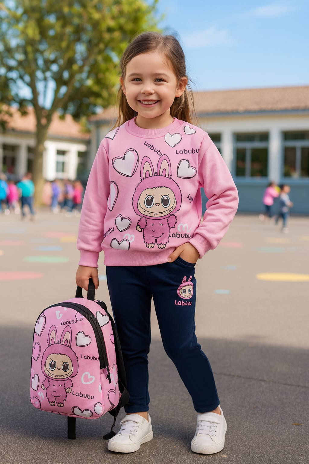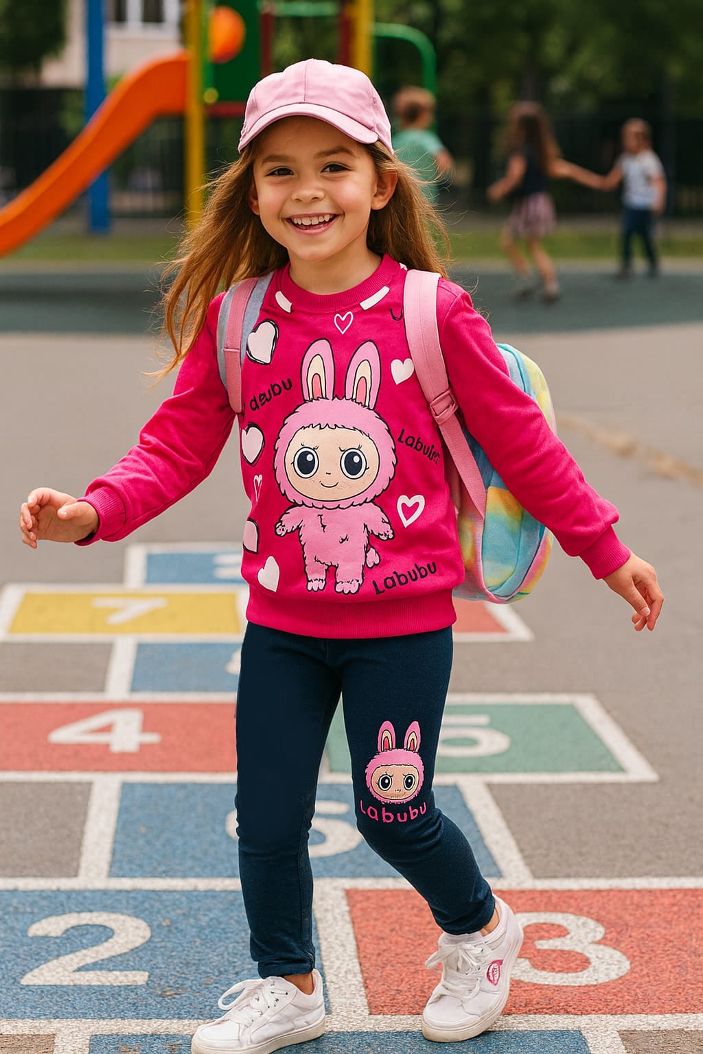O estampado divertido do Labubu dá um toque único e cheio de personalidade, enquanto a legging garante liberdade de movimentos para brincar e aprender.